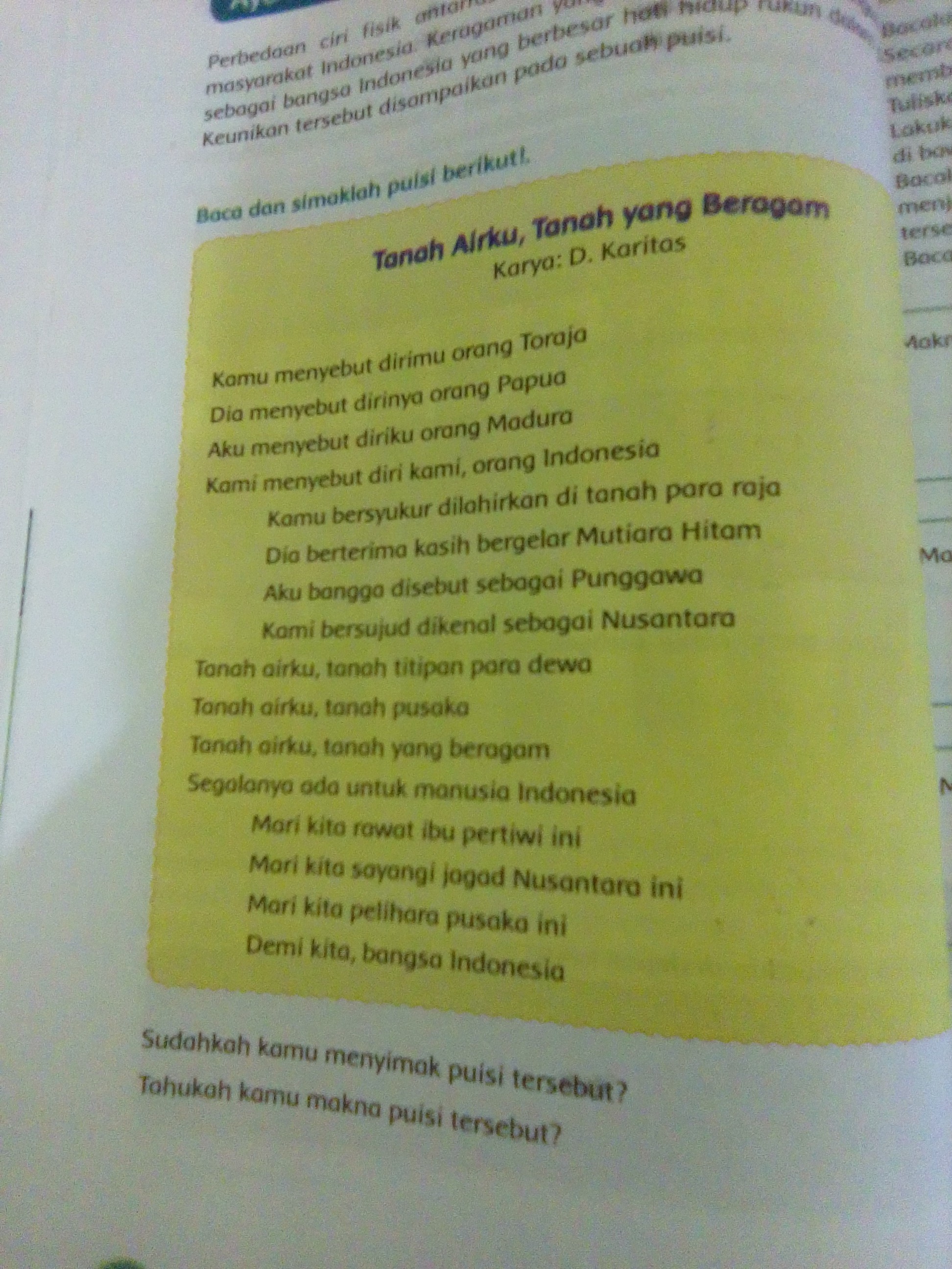 Tanah airku indonesia, negeri tercinta. Walaupun berasal dari suku dan ras berbeda, kita semua adalah orang indonesia. Makna puisi bait pertama adalah meski beraneka ragam suku, kita semua adalah orang indonesia. Lalu ringkaslah menjadi satu paragraf yang lain untuk mewakili makna keseluruhan puisi tersebut. Mari kita rawat ibu pertiwi ini. Indonesia adalah negara yang kaya. Mari kita sayangi jagad nusantara ini. Mari kita sayangi jagad nusantara ini mari kita pelihara pusaka ini. Segalanya ada untuk manusia indonesia. Mari kita rawat ibu pertiwi ini. Jun 13, 2021 · jawaban dari bacaan tanah airku tanah yang beragam. Indonesia sekolah menengah pertama terjawab Bacalah kembali makna setiap bait di dalam puisi tersebut.